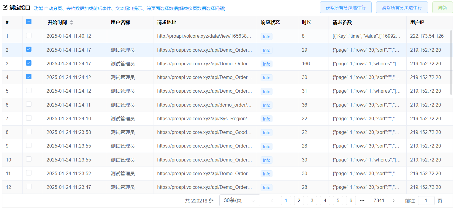 <vol-title icon="edit" title="绑定接口">功能:自动分页、表格数据加载前后事件、文本超出提示、跨页面选择数据(解决多页数据选择问题)</vol-title>