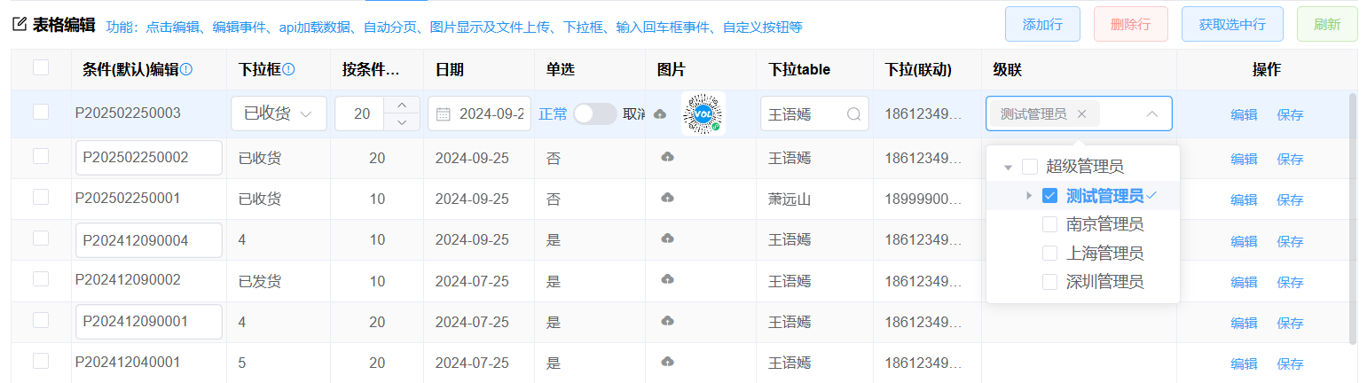 1.功能:按条件编辑、编辑事件、api加载数据、自动分页、图片显示及文件上传、下拉框、输入回车框事件、下拉table、自定义按钮等